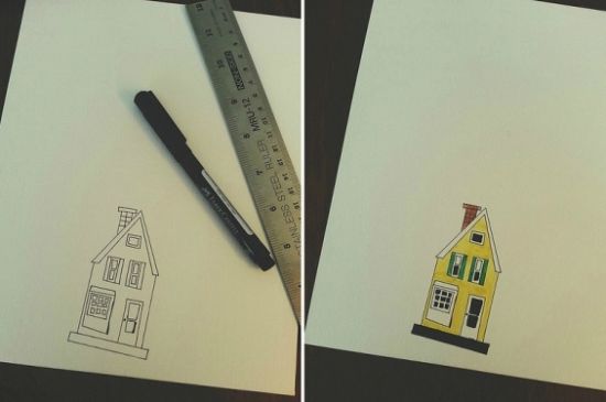 Comece desenhando uma casinha (com o modelo e forma que você quiser) no papel, mas faça uma casinha um pouco de lado, como se ela estivesse sendo levada pelos balões. Após desenhar, pinte toda a casinha da forma que desejar e com o material que quiser.
