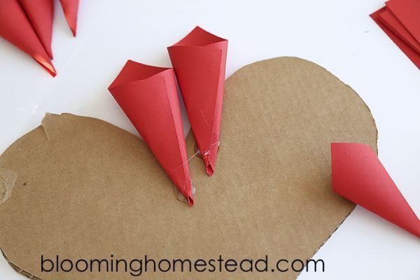 Em seguida, siga colando os cones maiores ao redor da borda do coração.