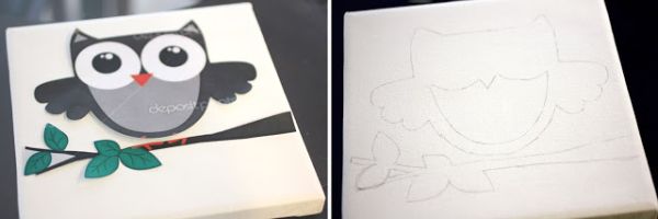Comece separando todos os materiais que você vai utilizar em seu trabalho. Depois transfira o molde da coruja escolhida para a tela para pintura.
