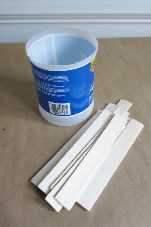Corte a vasilha de amaciante com a altura desejada. Depois forre o local onde você vai trabalhar com a sua peça, com jornal velho, papel velho, papelão, tecido velho ou plástico. Pinte os pedacinhos de madeira com a cor escolhida. Se você quiser uma cor mais forte e intensa, aplique duas ou até mesmo três camadas de tinta, porém sempre deixando a tinta secar muito bem entre uma camada e outra. E deixe a tinta secar muito bem antes de manusear novamente a sua peça e continuar com a confecção de seu trabalho. Cole os pedacinhos de madeira ao redor da vasilha de amaciante.