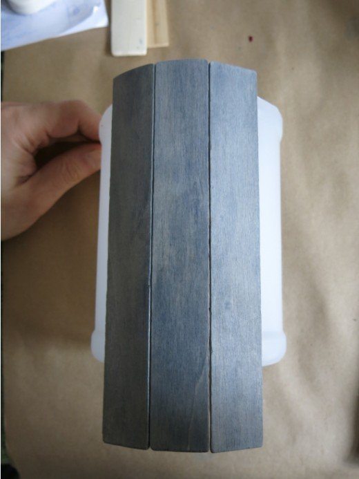 Corte a vasilha de amaciante com a altura desejada. Depois forre o local onde você vai trabalhar com a sua peça, com jornal velho, papel velho, papelão, tecido velho ou plástico. Pinte os pedacinhos de madeira com a cor escolhida. Se você quiser uma cor mais forte e intensa, aplique duas ou até mesmo três camadas de tinta, porém sempre deixando a tinta secar muito bem entre uma camada e outra. E deixe a tinta secar muito bem antes de manusear novamente a sua peça e continuar com a confecção de seu trabalho. Cole os pedacinhos de madeira ao redor da vasilha de amaciante.