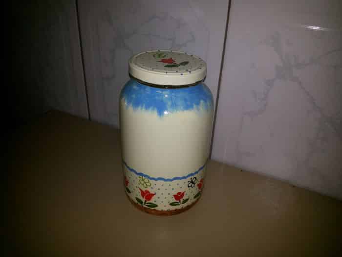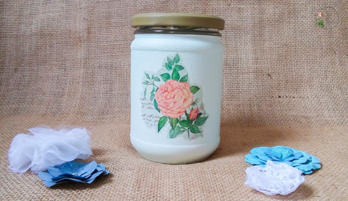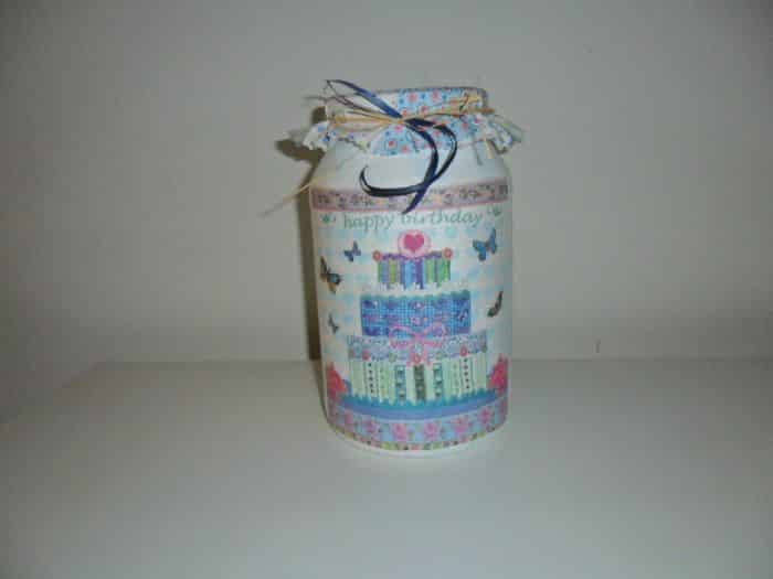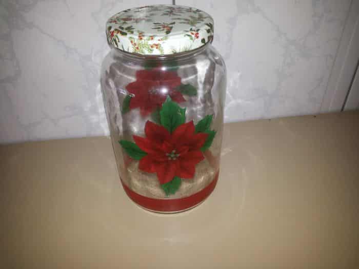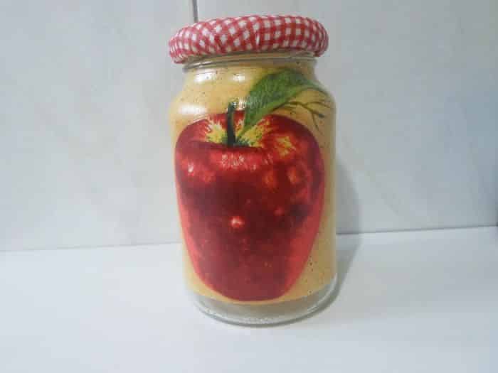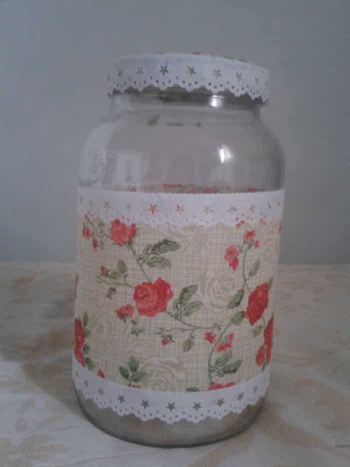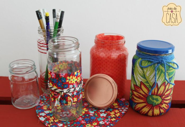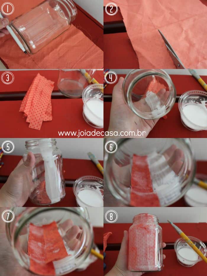 O vidro de azeitona pode ter o tecido decorando-o. Cole tiras de tecido dentro do seu pote, com o auxílio de cola para decoupagem.