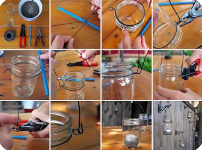 Com o auxílio de um lápis ou de uma caneta, faça argolas nas laterais do pote, para prender a alça. Faça a alça com o tamanho que você desejar e fixe nas laterais do pote. Para finalizar a sua peça, coloque o suporte dentro do vidro e coloque a vela no suporte. E está pronto!