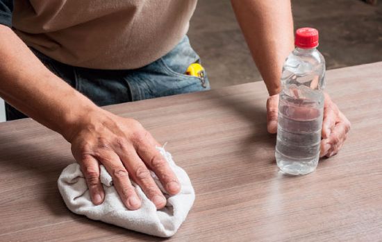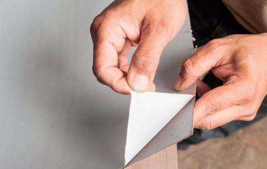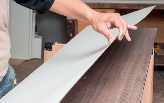 Agora, posicione com precisão a placa do laminado sobre a parte escolhida da madeira e aplique.