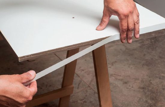 Agora, para finalizar a peça, caso a fita ultrapasse os limites das bordas, faça os arremates necessários com uma espátula de lâmina afiada e retilínea. E faça um bom acabamento com a lixa de madeira nº 320, passando-a levemente nas bordas, pois este procedimento é útil para eliminar as irregularidades no encontro do laminado adesivo com a fita de borda. E está pronto!