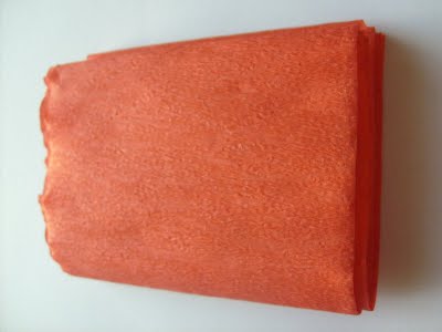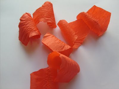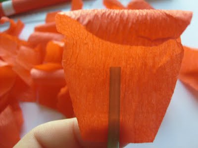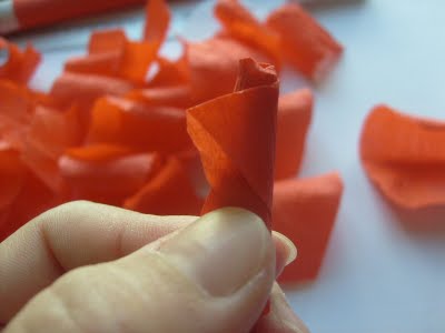 Desenrole a fita do papel crepom e vá dobrando ao meio até formar um retângulo. Corte as laterais para formar a base das pétalas.