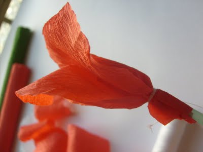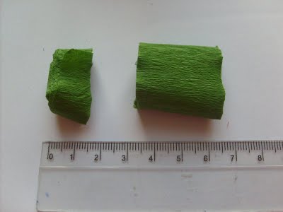 Para fazer o acabamento corte o papel crepom verde. Corte uma tira de 1 cm; e outra mais larga, com 3 cm, desenrole e vá dobrando ao meio para fazer a folha.