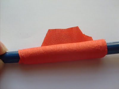 Para começar a fazer a rosa pegue o palito ou canudo e posicione no meio da pétala, logo após dobre a pétala ao meio e para baixo e em seguida, enrole a pétala no canudo ou palito. Este será o miolo da rosa.
