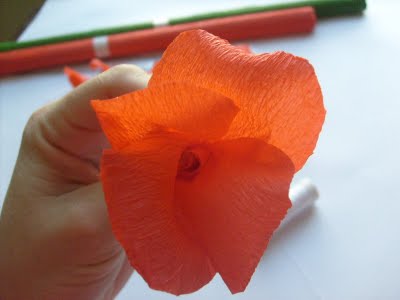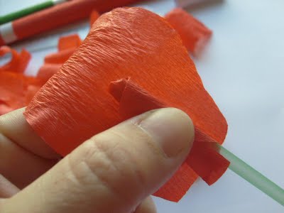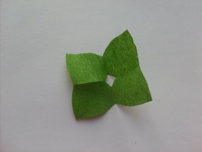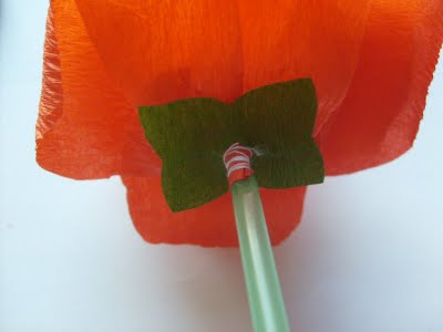 Corte também um quadrado do papel crepom verde, dobre em quatro e corte as pontinhas. E posicione no canudo, como base da rosa e coloque um pingo de cola branca para fixar.