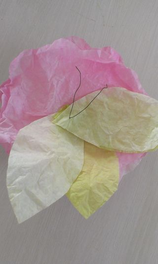 Comece separando todos os materiais que você vai utilizar em seu artesanato. Em seguida, corte um círculo em um papel de seda, para ser o miolo de sua flor. Depois dobre o círculo em quatro e corte a borda, em formato pontiagudo.