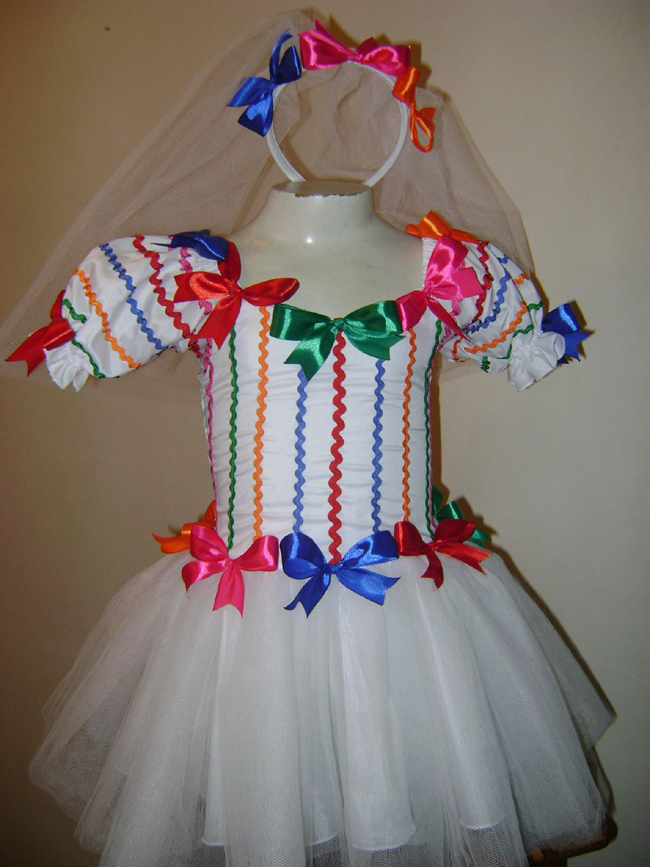 Noivinhas de festa junina podem investir em um vestido branco comum e fazer muitos laços de fitas e fixar estes laços no vestido. Costurar aviamentos também é ótima alternativa para este caso.