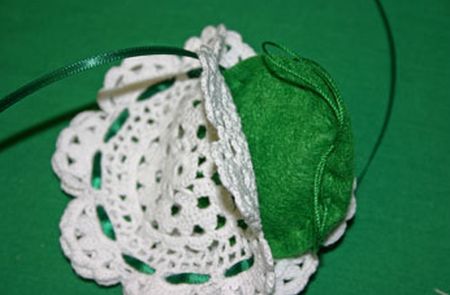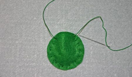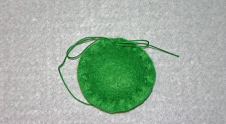 Comece cortando dois círculos no feltro verde, mas com o tamanho do centro da peça rendada que você escolheu. Depois passe a linha na agulha e comece a costurar ao redor dos dois círculos, juntando-os. Deixe uma abertura perto do final e encha a peça com o enchimento escolhido e pingue algumas gotas da essência escolhida.