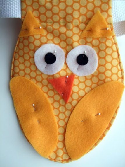 Em seguida, prenda e costure as partes de feltro, da sua coruja, os detalhes.