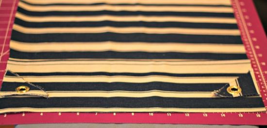 Comece cortando dois quadrados no tecido listrado, depois corte os quadrados ao meio, criando quatro triângulos e costure cada triângulo junto, com o lado do direto do tecido para fora e com ponto decorativo nas bordas. Depois fixe o ilhós.