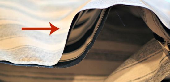 Logo após, posicione o outro retângulo sobre o primeiro, com o lado direito em contato com o lado direito do primeiro, passe uma costura ao redor, mas deixando a borda superior (parte oposta à que está os triângulos com ilhós) e corte os cantos inferiores em diagonal.