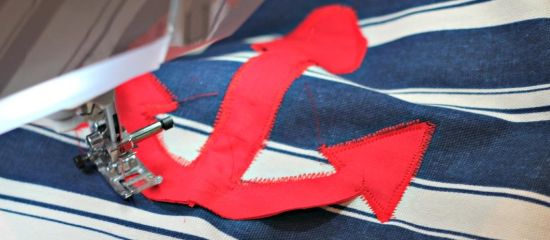 Logo após, transfira o molde da âncora para o tecido vermelho e borde a âncora em sua sacola com pontos decorativos em sua máquina de costura ou até mesmo com ponto ziguezague, caso a sua máquina não possua ponto decorativo.