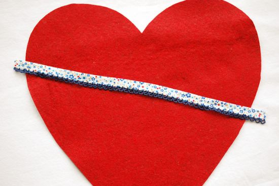 Em seguida, corte um pedaço da fita de aproximadamente 30 cm. Posicione em um ângulo ao longo de um dos corações maiores. Deve sobrar um pequeno pedaço de fita de cada lado do coração.
