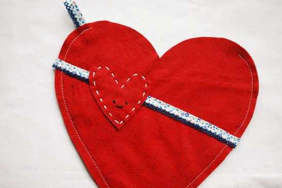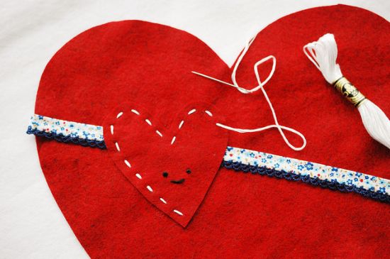 Agora, borde à mão a carinha no coração menor. Em seguida costure o coração na frente da sua sacola, sobrepondo à fita.