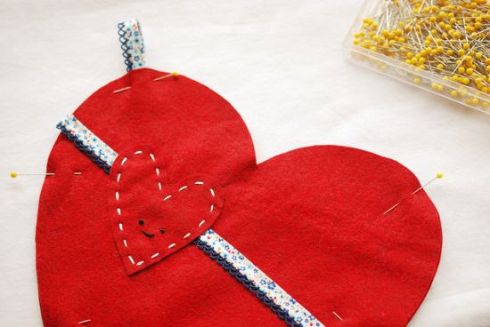 Logo após, dobre as sobras de fita para o verso do coração, prenda com alfinetes e então comece a costurar a fita no lugar usando a sua máquina de costura.