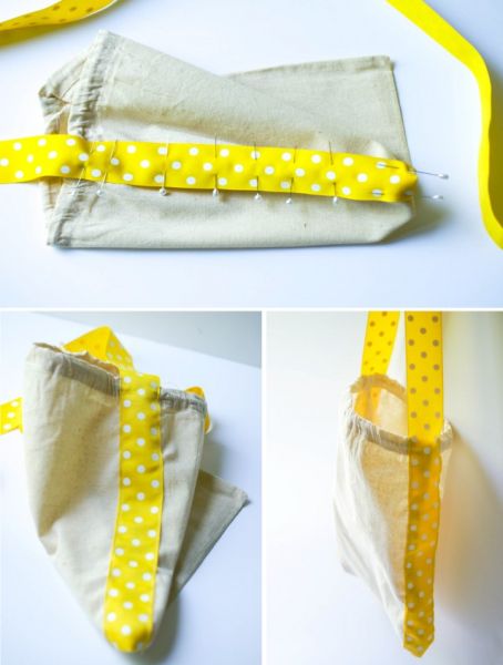 Em seguida, vire a ponta na da fita larga escolhida e posicione-a na base da sua sacola, sobre uma das costuras laterais. Prenda a fita por toda a lateral da sacola de tecido. Meça o tamanho que você quer para a alça de sua peça e, após deixar esta medida sobrando, prenda a fita larga no outro lado da sacola. Quando chegar à base da sacola, vire a ponta da fita larga para dentro e prenda. Costure à mão a fita larga em sua sacola de tecido.