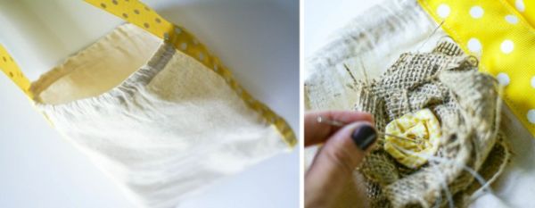 Logo após, costure a flor de juta perto da borda da sua sacola e no meio da flor de juta costure à mão uma flor pequena de tecido.