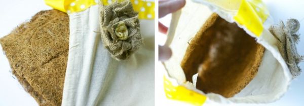 Agora, para finalizar a sua personalização de sacola de tecido, basta colocar a manta de fibra de coco dento da sua sacola, colocar terra e colocar a plantinha que você desejar. E está pronto!