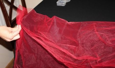 Logo após, continue franzindo o tule e prendendo esta parte franzida na toalha de mesa, com o auxílio dos alfinetes para costura sem cabeça.