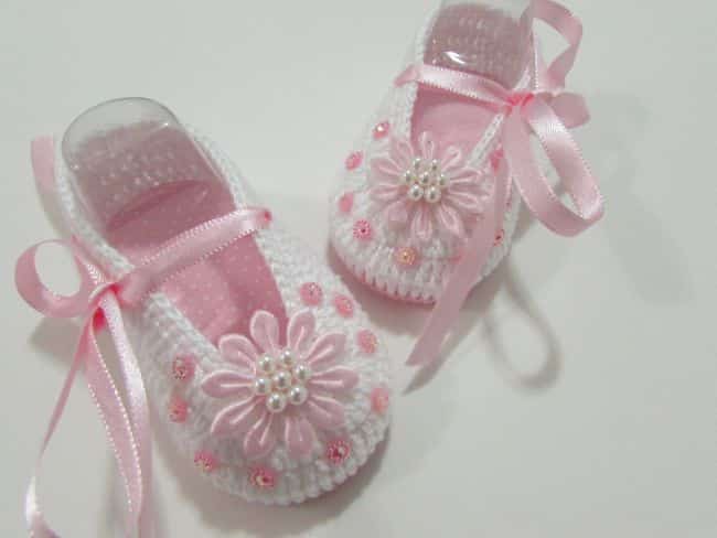 Outro modelo de sapatilha infantil em crochê que faz o maior sucesso é o modelo bailarina, que possui fita para amarrar na perninha.