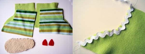 Logo após, transfira as partes do molde para as respectivas cores dos feltros escolhidos. Costure a sianinha grande na parte do sapatinho que ficará na frente. Na ponta perto do solado costure a língua.
