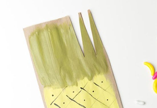 Forre o local onde você vai trabalhar com a sua peça, com jornal velho, papel velho, papelão ou plástico. Pinte a parte central do saquinho de papel com as cores do abacaxi, pintando a base de amarelo e a parte da borda com a tinta verde. Não precisa pintar de maneira precisa as laterais do saco de papel, basta pintar a parte do centro. Se você quiser uma cor mais forte e intensa, aplique duas ou até mesmo três camadas de tinta, porém sempre deixando a tinta secar muito bem entre uma camada e outra. E deixe a tinta secar muito bem antes de manusear novamente a sua peça. Após a tinta estar totalmente seca, faça os risquinhos e bolinhas do detalhe do abacaxi.