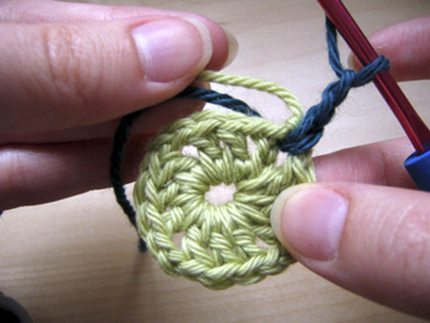 Comece a fazer o Square com algumas correntinhas na cor verde clara e vá aumentando ela até certo ponto e depois prepare para entrar com outra cor.