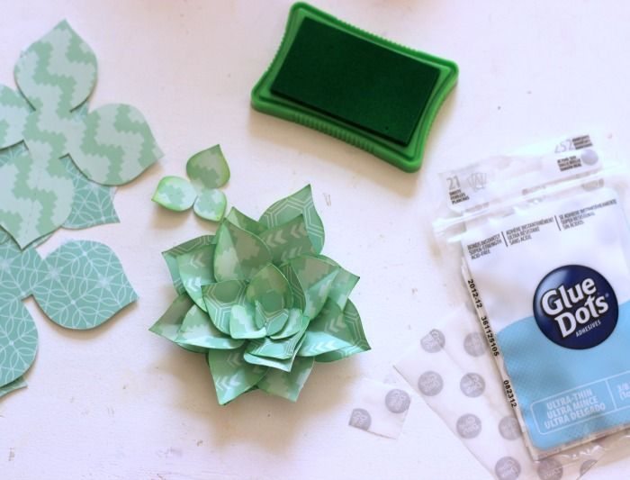 Se você quiser, aplique a tinta para carimbo verde ao redor das pétalas da sua suculenta, com o auxílio da almofada para carimbo. Dobre e eleve as pétalas de sua suculenta. Cole uma camada na outra, com as camadas maiores por baixo, e com o auxílio da cola branca comum, da fita dupla face ou da cola em bastão, dependendo de sua preferência.
