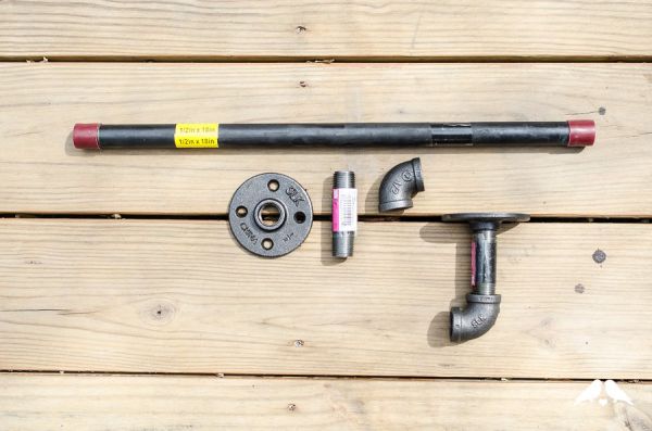 Em seguida, fixe o cano maior no cotovelo e fixe o conector na outra entrada do cotovelo. E fixe a outra parte do conector na plaquinha redonda de metal.