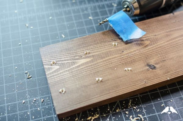 Agora, posicione um pedaço de fita adesiva na broca da furadeira e faça os furos em seu pedaço de madeira.