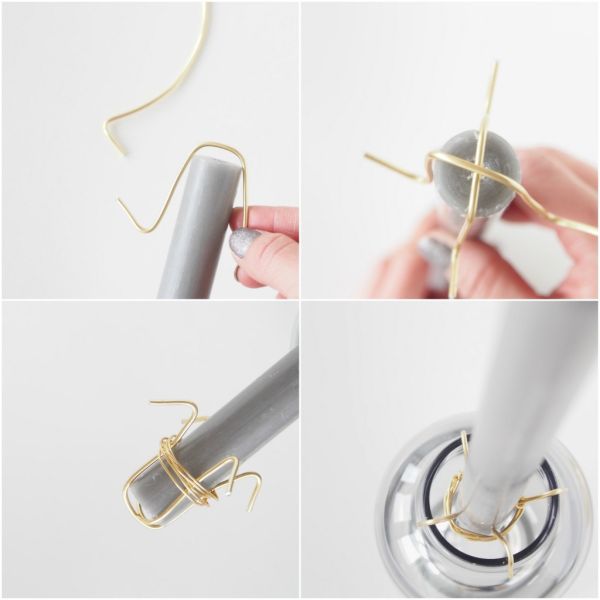 Em seguida, meça a metade de cada pedaço de arame, posicione a metade do pedaço de arme no fundo da vela e dobre ao meio este pedaço de arame. Faça o mesmo com o outro pedaço de arame, posicionando o segundo pedaço de arame de forma cruzada com o primeiro pedaço de arame. E, então, passe um terceiro pedaço de arame ao redor da vela e dos dois pedaços de arame, para prender os pedaços de arame ao redor da vela, e, assim, criar o suporte para a vela. Não aperte muito o arame que envolve todas as partes, para você pode colocar e retirar a vela com facilidade. Fala um teste se o suporte se encaixa perfeitamente na borda do vaso escolhido.