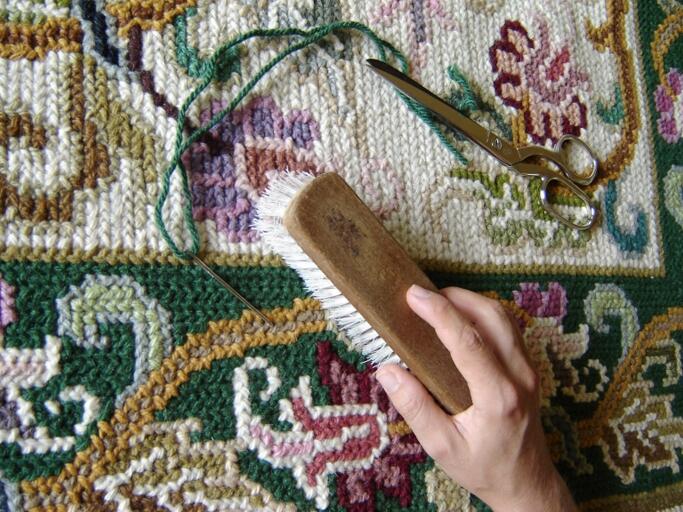 Depois que preencher totalmente o tapete, ele deve ser escovado, isso serve para perceber se é necessário algum arremate, se falta algum preenchimento ou engano em alguma cor.