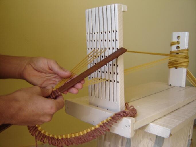 Para o acabamento deve ser feito um tear de franja, com as linhas trançadas e presas por uma auréola.