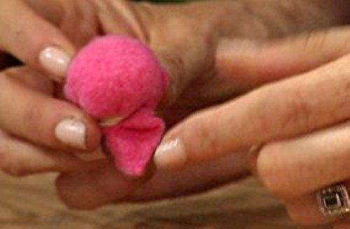 - Para inserir o pompom é necessário inserir ele dentro de um pedaço de feltro amarrado com elástico, dessa forma ele não irá se desmanchar ao inserir ele no tapete. Depois remova o envoltório.
