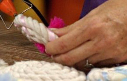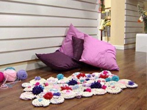 - Depois prenda o pompom no centro de cada caracol, dando um efeito especial ao tapete.