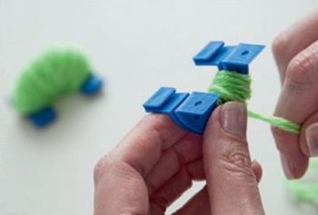 Em seguida, faça os pompons. No método tradicional de fazer pompons, são usados círculos de papelão com um furo no meio, porém eles rasgam facilmente, mas nada impede que você os utilize. Mas aqui foi utilizado o disco pompom fácil, um acessório formado de quatro arcos plásticos, encaixados em pares, que rende pompons de 4 cm.