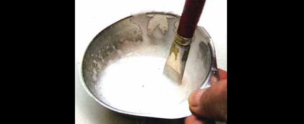 É um líquido branco, que ao secar, fica completamente transparente, sem manchas.