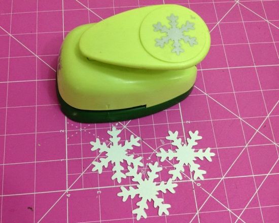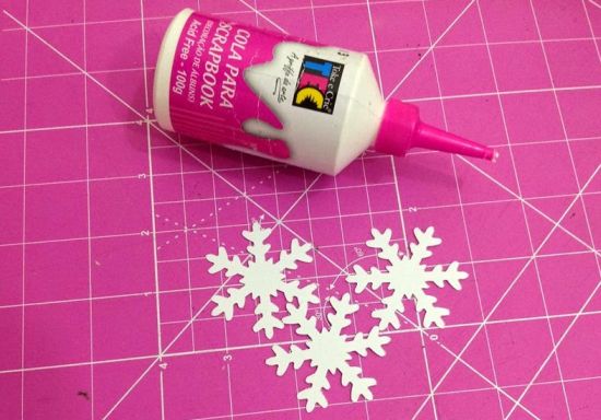 Em seguida, com o auxílio da cola para scrapbook, cole três flocos um no outro, para que as duas peças resultantes fiquem mais firmes.