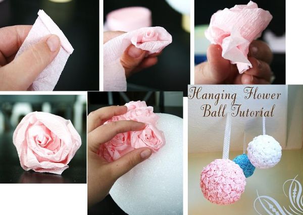Você pode pendurar a bola de isopor decorada com flores de papel crepom, e no teto ou na parede de qualquer lugar, sejam e sua casa ou em sua festa. E a sua bola de flores de papel pode ter o tamanho que você desejar.