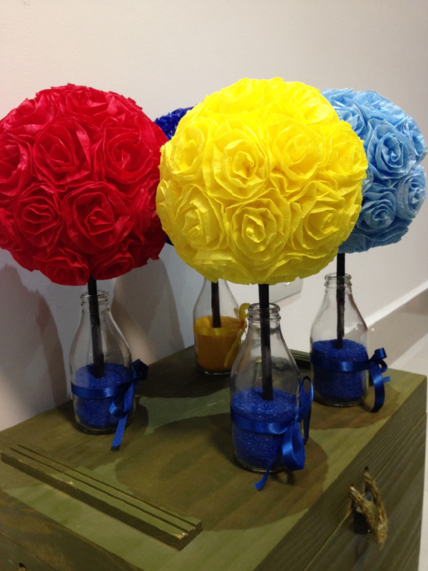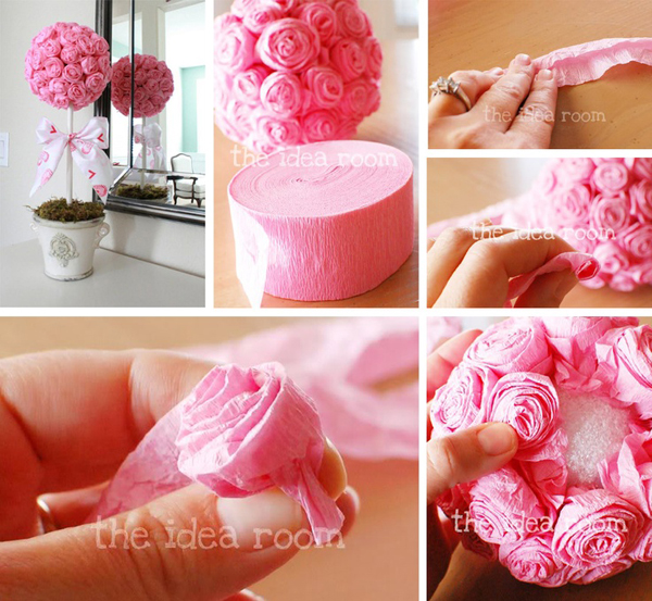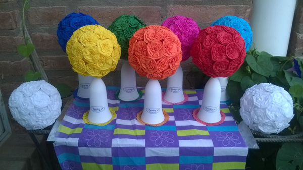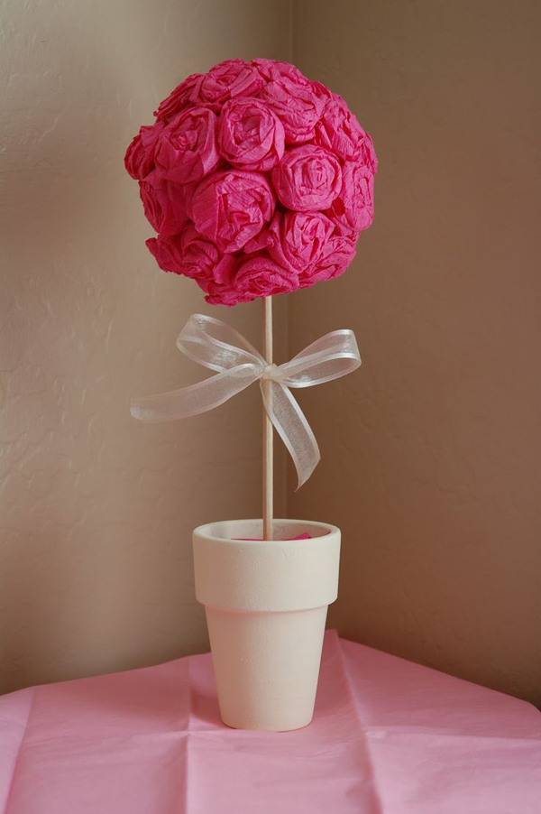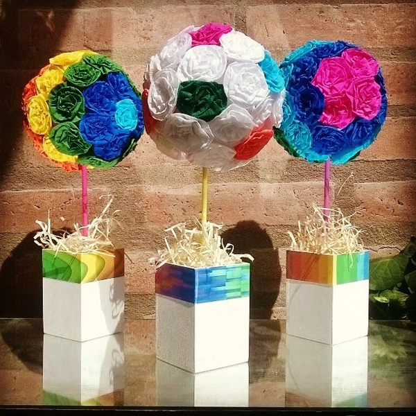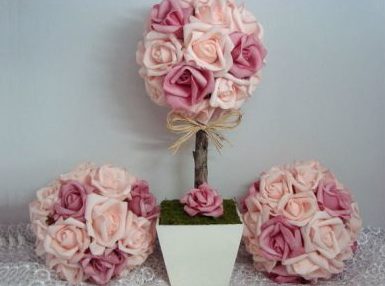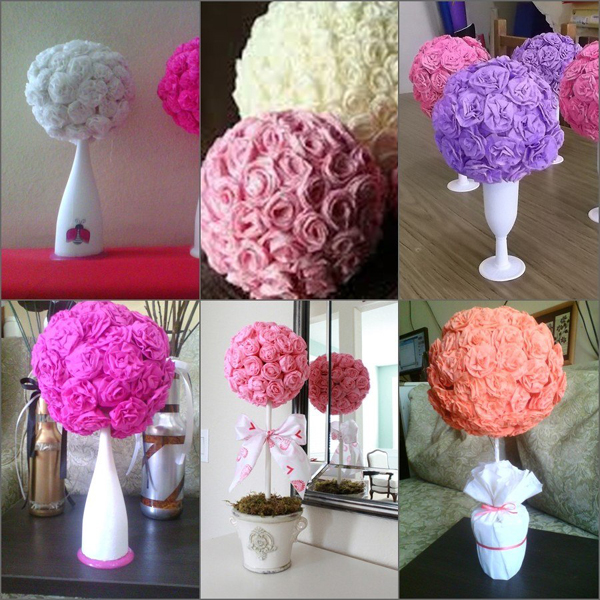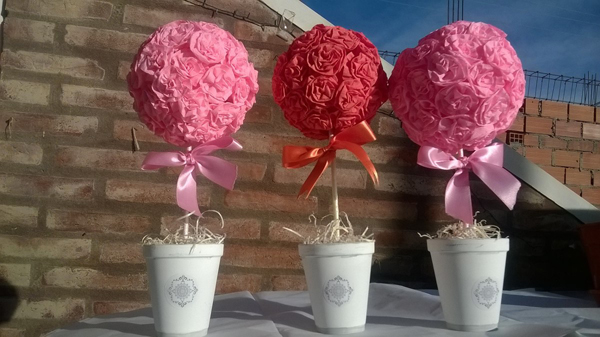 A topiaria de crepom surpreende pela beleza e pode ter vários estilos diferentes, desde os mais simples, com tufos e papel crepom ao redor da bola de isopor, até modelos mais sofisticados, feitos com flores de papel crepom.