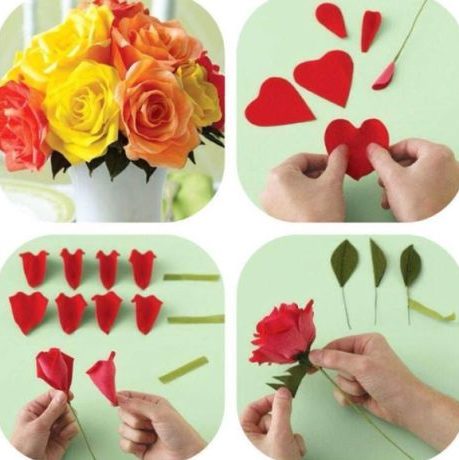 Se você não quiser fazer uma topiaria, usando uma boa de isopor como base, você pode criar um processo de buquê de papel crepom passo a passo, apenas posicionando as flores em um vaso com a borda estreita e com os caules com tamanhos diferentes, para que o arranjo fique arredondado.