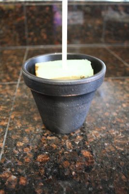 Em seguida, corte um pedaço de espuma floral, acomode dentro do vasinho escolhido e fixe no centro deste pedaço de espuma floral o palito de plástico.
