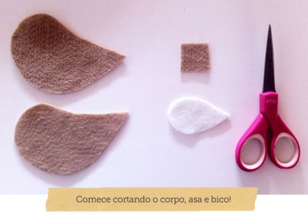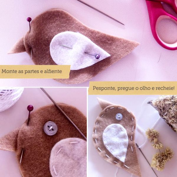Logo após, comece a montar o seu pombinho. Posicione a asa sobre o corpo do pombinho e prenda com o auxílio de alfinete para costura, e logo após, costure-a no corpo, com pontos simples de bordado. Depois pregue o botão como se fosse o olho do seu pombinho. E então, prenda o bico e comece a costurar as duas partes do corpinho juntas, fazendo pontos simples à mão com o auxílio de uma agulha para bordado e de uma cor de linha para bordado que você prefira, mas que combine com a cor do feltro escolhido.