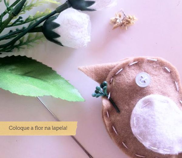 Agora, antes de terminar de costurar as duas partes do corpo juntas, encha a peça com o enchimento de sua preferência e termine de fechar com os pontos à mão. E prenda um raminho da flor escolhida, na parte perto do bico.