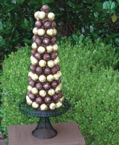 Para fazer esta linda e deliciosa torre você irá precisar de: bombom de sua preferência (aqui foi usado o bombom Ferrero Rocher, porém você pode usar o bombom que você quiser, para isso basta encapar os bombons com os papéis com as cores condizentes com o restante da decoração da festa); espuma ou isopor em formato de cone/torre; tesoura; alfinete para costura; palitos de dente; e tecido para forrar o cone de espuma.