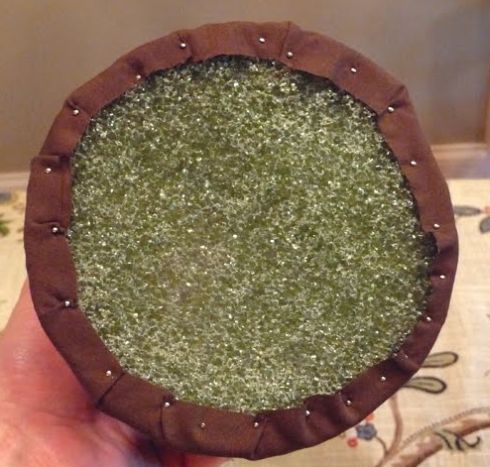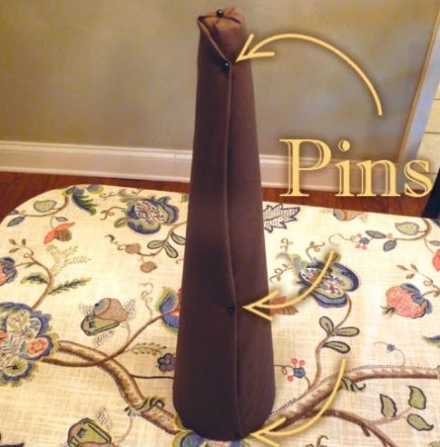 Comece encapando o cone de isopor ou de espuma com o tecido escolhido e, com o auxílio dos alfinetes para costura.